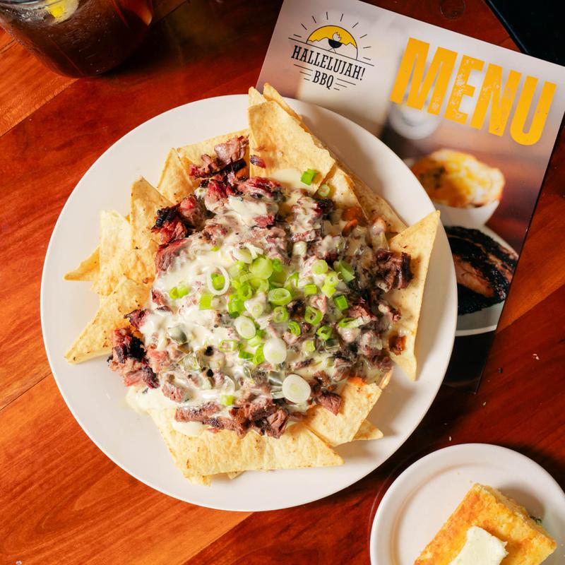 Tortilla chips with your choice of beef brisket, pulled pork, or 13 habanero sausage, topped with David’s beans and queso.